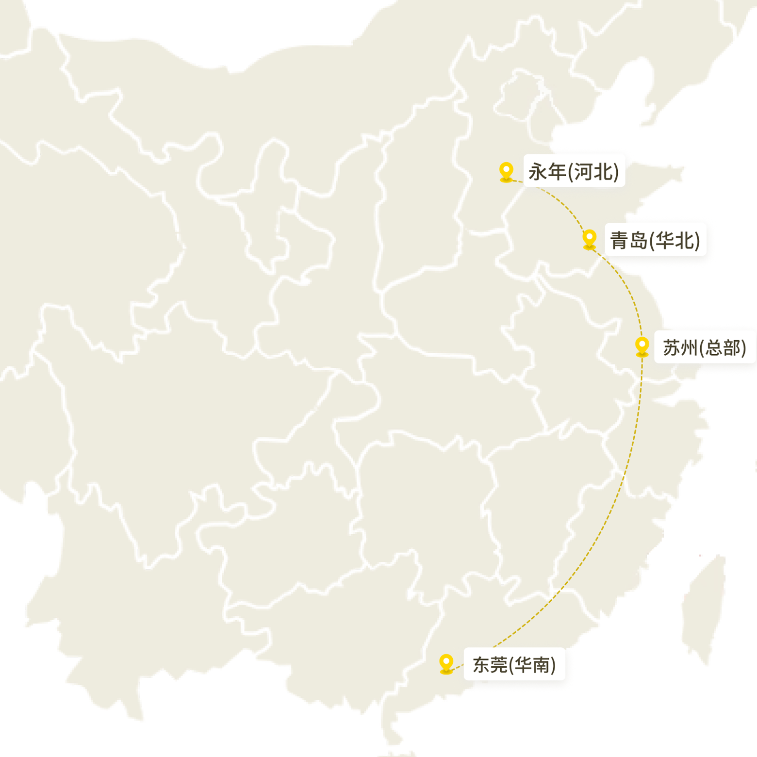 在 苏州、东莞、青岛、永年 设有大规模智慧枢纽。核心工业区实现 24 小时极速触达。
